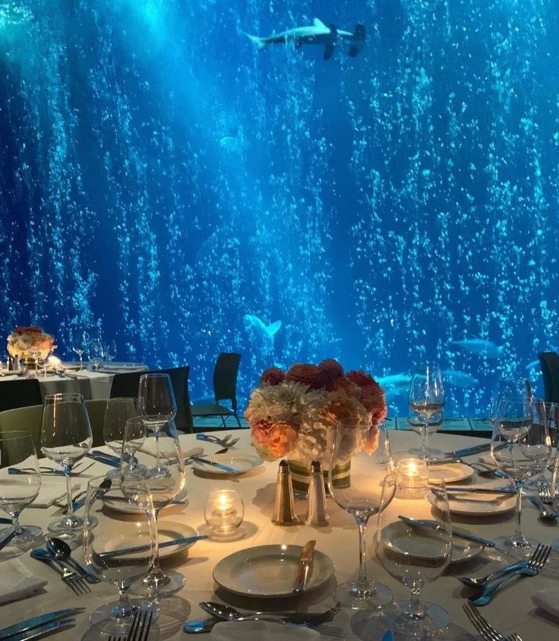 Just you, your fellow travelers, a gourmet three-course meal, and 1.2 million gallons of seawater filled with sharks, sea turtles, and schools of shimmering fish.